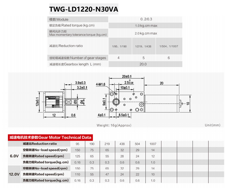 Der 12 * 20-mm-Getriebemotor bietet ein Drehmoment von 0,1 Nm und ist zuverlässiger