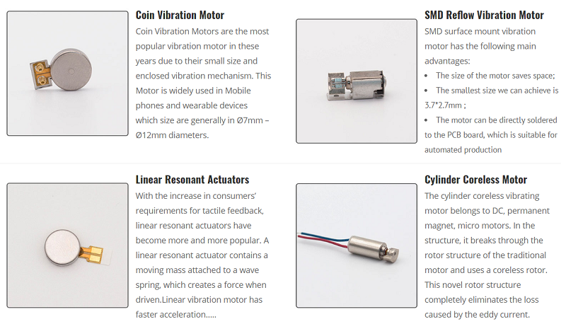 Motorning ichki tuzilmasiga ko'ra, biz odatiy tebranish motorini to'rt toifaga ajratamiz:3V tanga tipidagi motor(Shuningdek, tekis vibralashuv motori deb ataladi), SMD Ondustratsiya motorlari, chiziqli rezonans - lra va silindrli lra va silindrli motorlar.